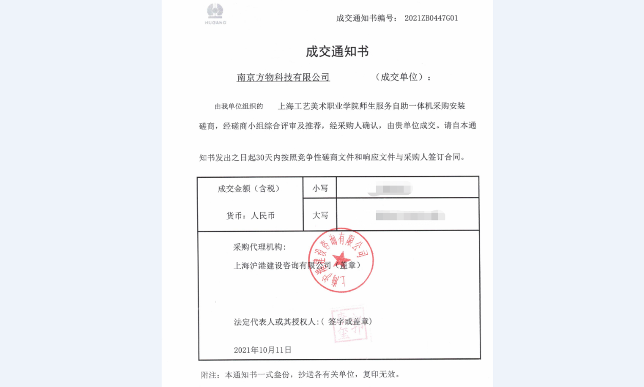近日,我司凭借丰富的施工经验、过硬的技术实力和良好的信誉,于2021年10月11日顺利中标《上海工艺美术职业学院师生服务自助一体机采购安装项目》。