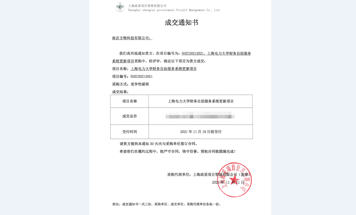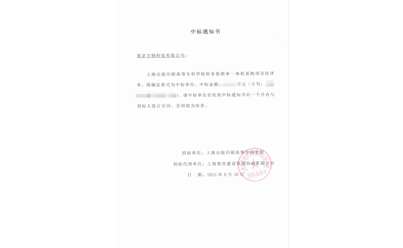 2022年8月29日,我司在上海出版印刷高等专科学校财务报销单一体机招标项目的竞标中,凭借过硬的产品质量,扎实高效的工作作风,完善的售后服务和良好的企业信誉,以绝对优势顺利中标。