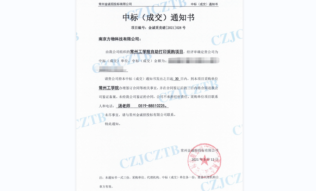 2021年5月12日,我司中标常州工学院自助打印采购项目,成为常州工学院深度合作伙伴。