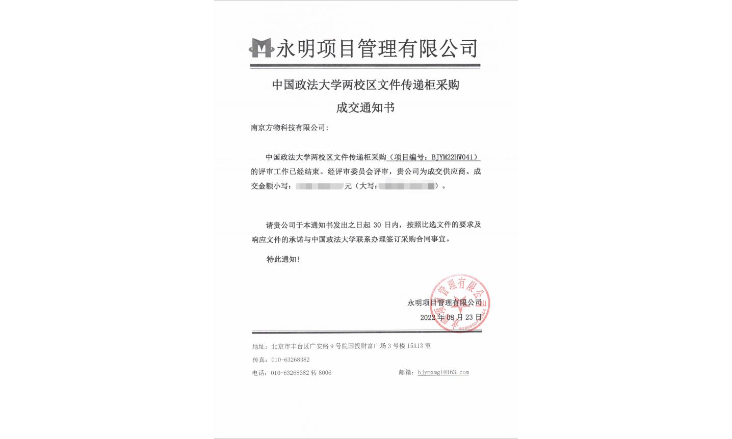 近日,我司凭借良好的信誉、成熟完善的技术方案,以及合理的报价在竞争对手中脱颖而出,成功中标《中国政法大学两校区文件传递柜采购项目》。