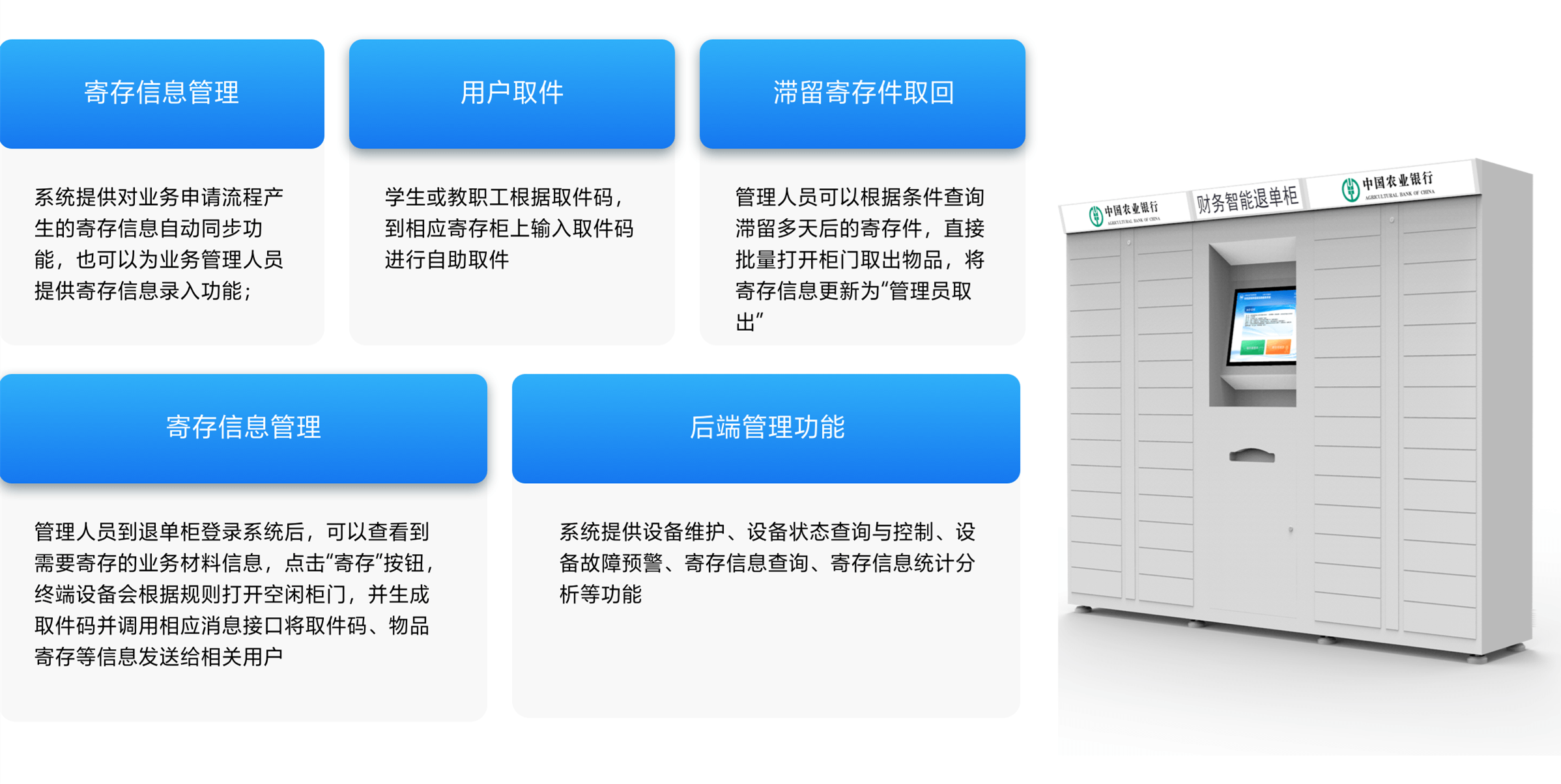 目前办事大厅中有不少业务流程在审批完成后,并没有全部结束,如学生证补办、教职工户籍证明办理等业务办结后还需要将相关材料交付给学生或教职工,这些工作只能是用户在特定的时间到办事大厅来取,并没有实现业务流程的完全自助流转;为解决这个问题,我们引进寄存柜,采用线上线下业务融合,实现办事大厅业务流程服务“最后一公里”,使得师生不受限于传统工作时间,无须一对一服务就能自助获取办理材料,其主要功能如下: