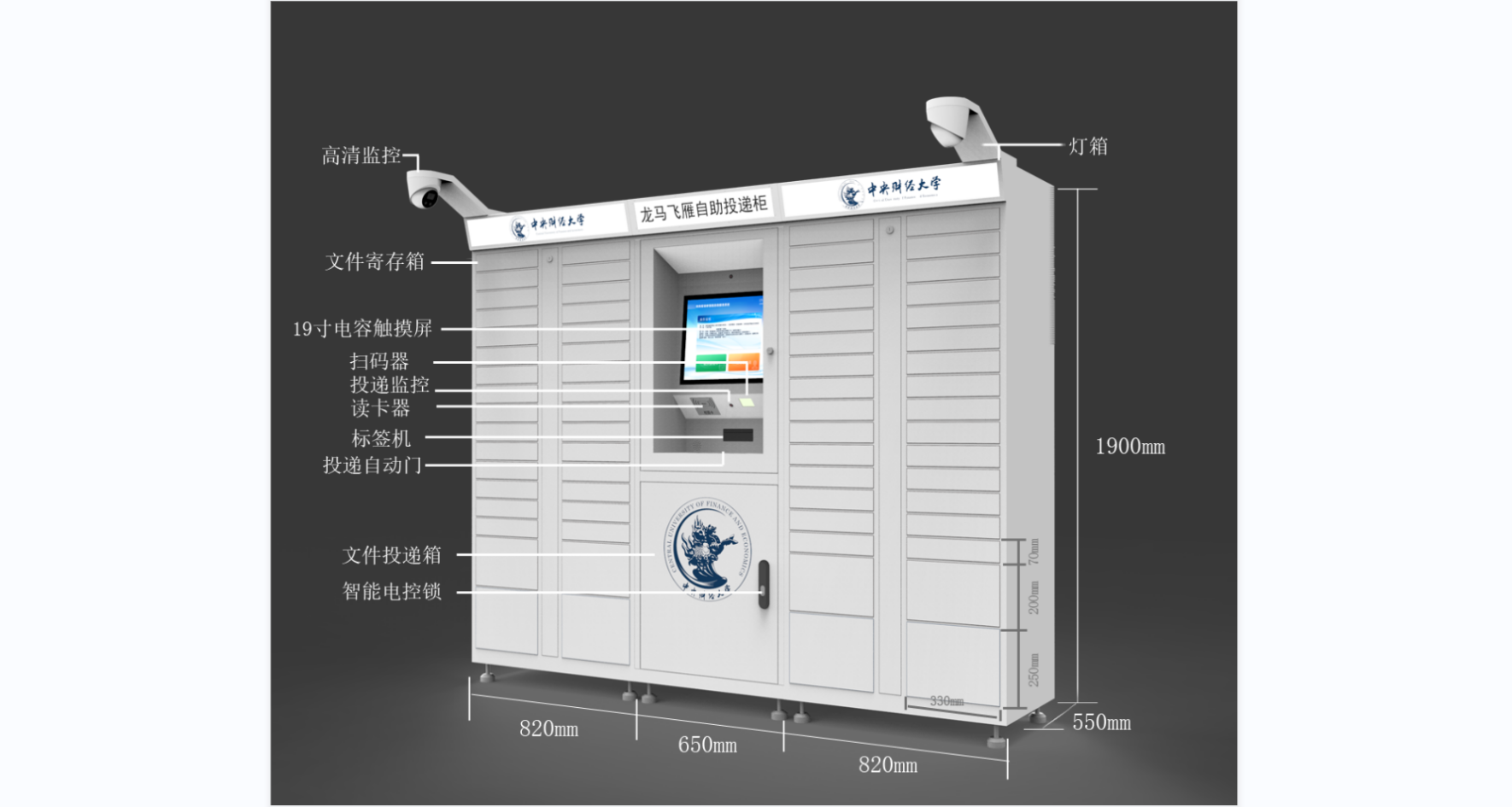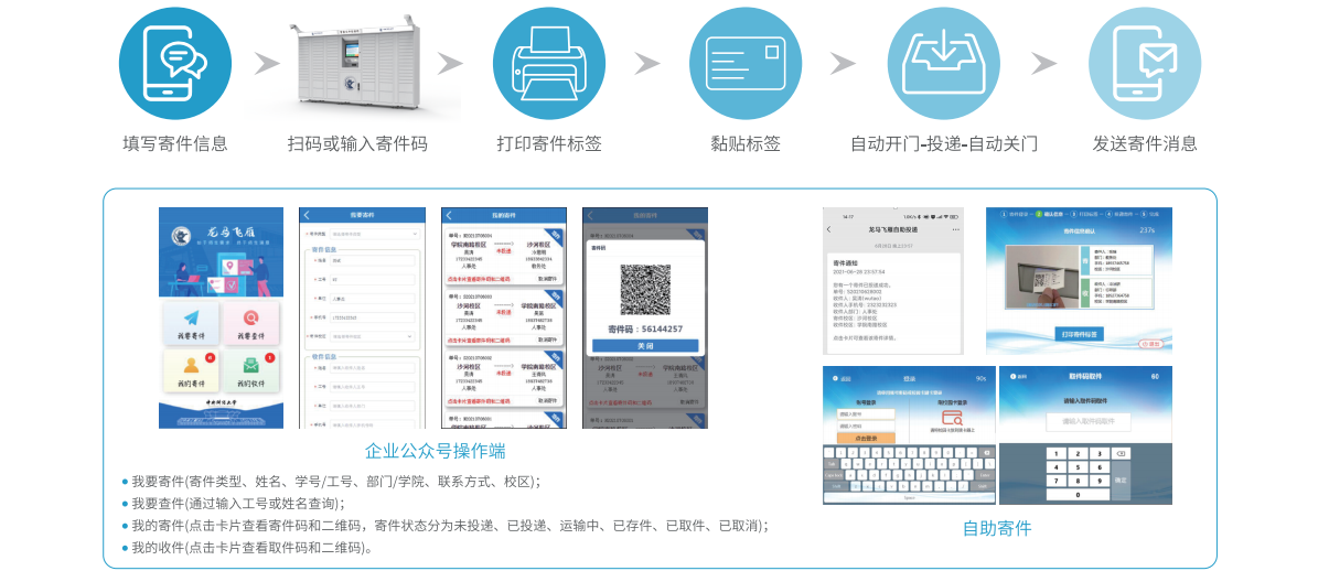 系统以智能设备为媒介,师生在手机填写寄件信息,通过终端设备实现文件自助投递,管理员取件并借助校车运输到另外一个校区,由校区管理员进行存件,系统自动发送取件码给收件人自助取件,从而实现两校区文件自助传递功能。