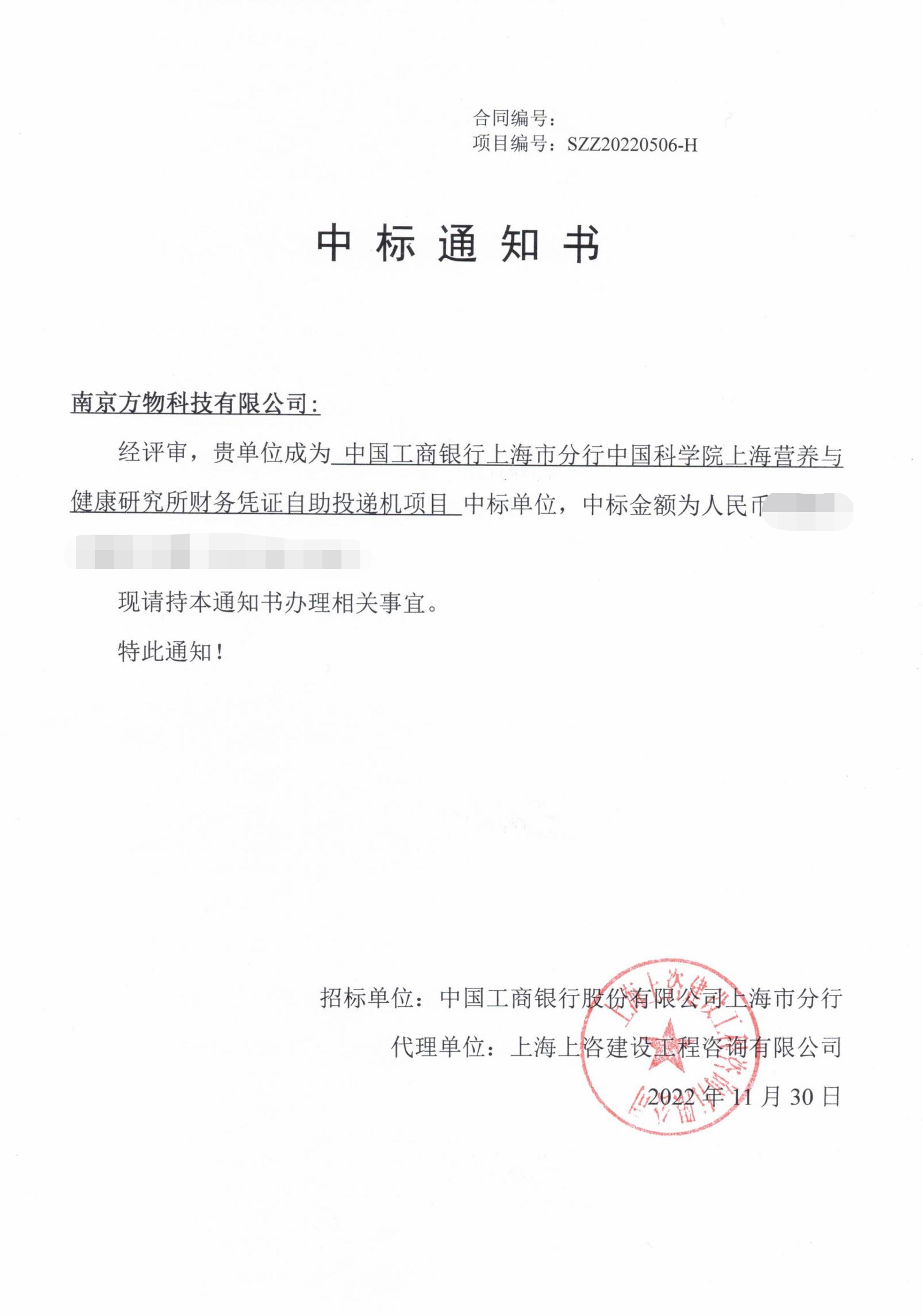 热烈庆祝我公司在《中国科学院上海营养与健康研究所财务凭证自助投递机项目》投标过程中以良好的信誉、丰富的行业经验、强大的技术实力以及优秀的文案、合理的报价获得评标专家组的一致认可,最终以第一名的成绩,顺利中标。