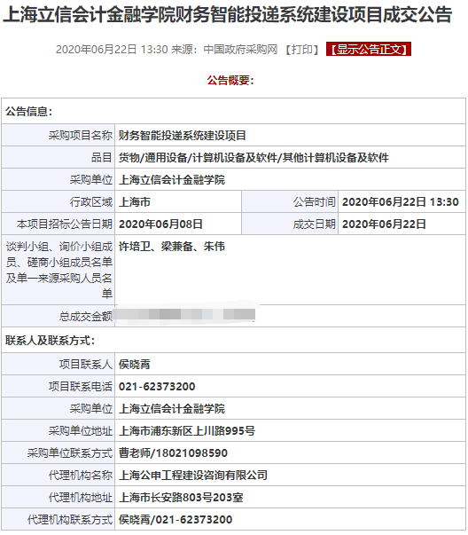 热烈祝贺我司中标上海立信会计金融学院财务智能投递系统建设项目